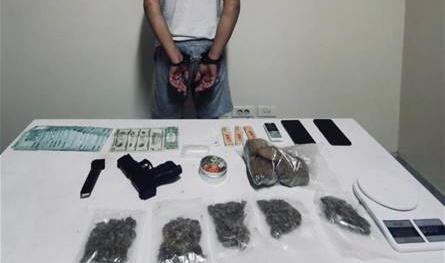 وضبطت بحوزته كميّة من مادّتي الماريجوانا، وحشيشة الكيف، معدّة للترويج، ميزان وأكياس نايلون تُستخدم في توضيب المخدّرات، مسدّس حربي، هاتف خلويّ ومبلغ مالي.