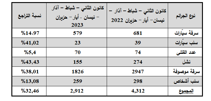 عمّمت المديرية العامّة لقوى الأمن الدّاخلي، جدولاً إحصائياً حول بعض الجرائم الهامّة (قتل، سلب، سرقة سيارات، سرقة موصوفة، نشل…) المرتكبة خلال النّصف الأوّل من العام 2023 (كانون الثّاني، شباط، آذار، نيسان، أيار وحزيران)، بحيث يوضح تراجعاً ملحوظاً مقارنةً مع الأشهر ذاتها من العام المنصرم.