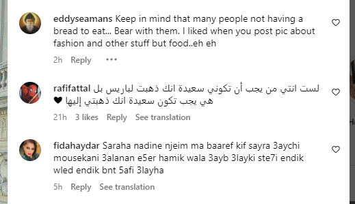 وجاء في التعليقات: “هيي وين وأزمة الشعب اللبناني وين، عم تذكرنا فيهن بالكافيار والمادليف”، وايضا: “افضل تنشري صور للموضة وخطيبك”. (رصد: لبنان 24)