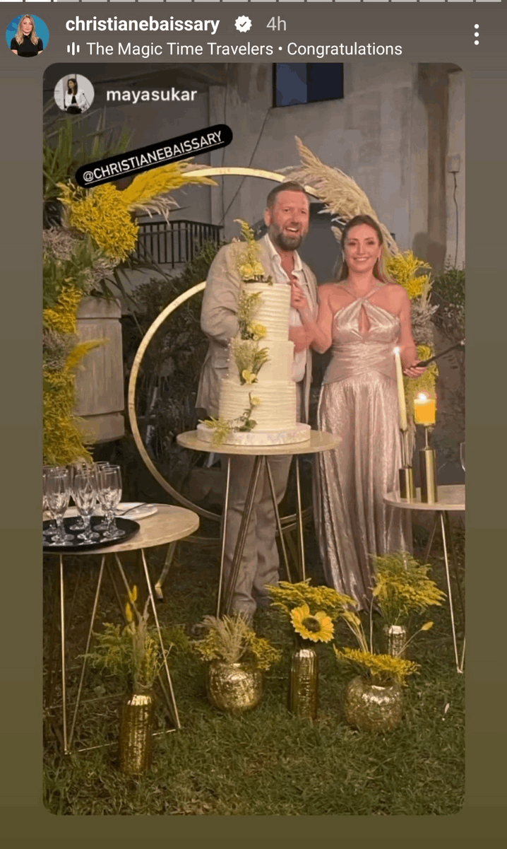 وأقيم حفل ما قبل الزفاف ظهرت فيه كريستيان بفستان ناعم باللون الذهبي إلى جانب عريسها الذي لم تكشف هويته.