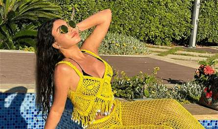 وظهرت في إحدى الصور وجالسة على حافة حوض السباحة بمايوه أسود اللون ارتدت فوقع من الكروشيه باللون الأصفر.