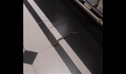 وبحسب الفيديو، فقد ظهرت الأفعى تحت أحد الرفوف المخصصة لعرض البضائع، الأمر الذي استدعى تدخلاً سريعاً من العاملين في المكان لمعالجة الأمر وإنتشال الأفعى من مكانها.