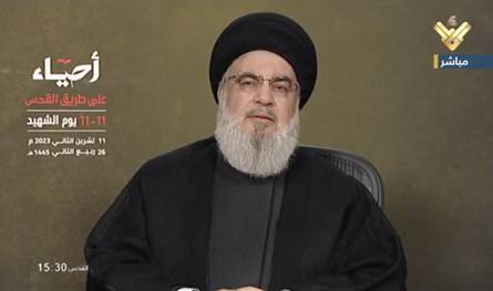 أكّد الأمين العام لـ”حزب الله” السيد حسن نصرالله أن عمليات المقاومة في لبنان ضدّ العدو الإسرائيلي سترتقي كماً ونوعاً، مشيراً إلى أنّ “جبهة المقاومة ستبقى ضاغطة”، وأضاف: “الموقف العام في لبنان مساعد وجيّد وقويّ ويجعل من جبهة لبنان قويّة، وأشيد مجدداً بالمقاومين الأبطال وأشيد بالبيئة الحاضنة المباشرة التي تتحمل عبء هذه المواجهة وعبء تقديم الشهداء وعبء التهجير من القرى الأمامية والموقف العام في لبنان المتضامن مع غزة”.