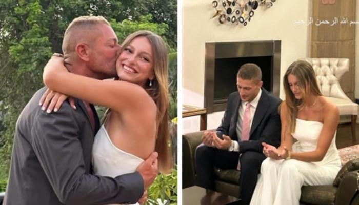 وشارك كذلك، صورة لابنته وخطيبها يجلسان بجانب بعضهما البعض يقرآن سورة الفاتحة، وصورة أخرى ظهر فيها يقف إلى جانب زوجته ميرال نور، وابنته تمارا وخطيبها.