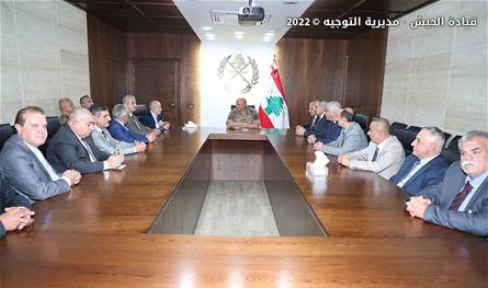 استقبل قائد الجيش العماد جوزاف عون في مكتبه باليرزة، رئيس رابطة قدامى القوات المسلحة اللواء الركن المتقاعد نقولا مزهر، على رأس وفد من الرابطة.