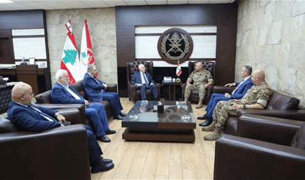 استقبل قائد الجيش العماد جوزاف عون في مكتبه في اليرزة، عضو اللجنة التنظيمية لمنظمة التحرير الفلسطينية عضو اللجنة المركزية لحركة “فتح” الوزير عزام الأحمد، يرافقه السفير الفلسطيني أشرف دبور وأمين سر “فتح” والفصائل الفلسطينية فتحي أبو العردات.
