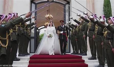 ومن أجمل اللقطات أيضا كان الموكب الأحمر، الذي اتخذ شكل علم الأردن، والذي دار بالعروسين اللذين ألقيا التحية على الشعب وهما على متن سيارة بيضاء مكشوفة من طراز “لاندروفر”.