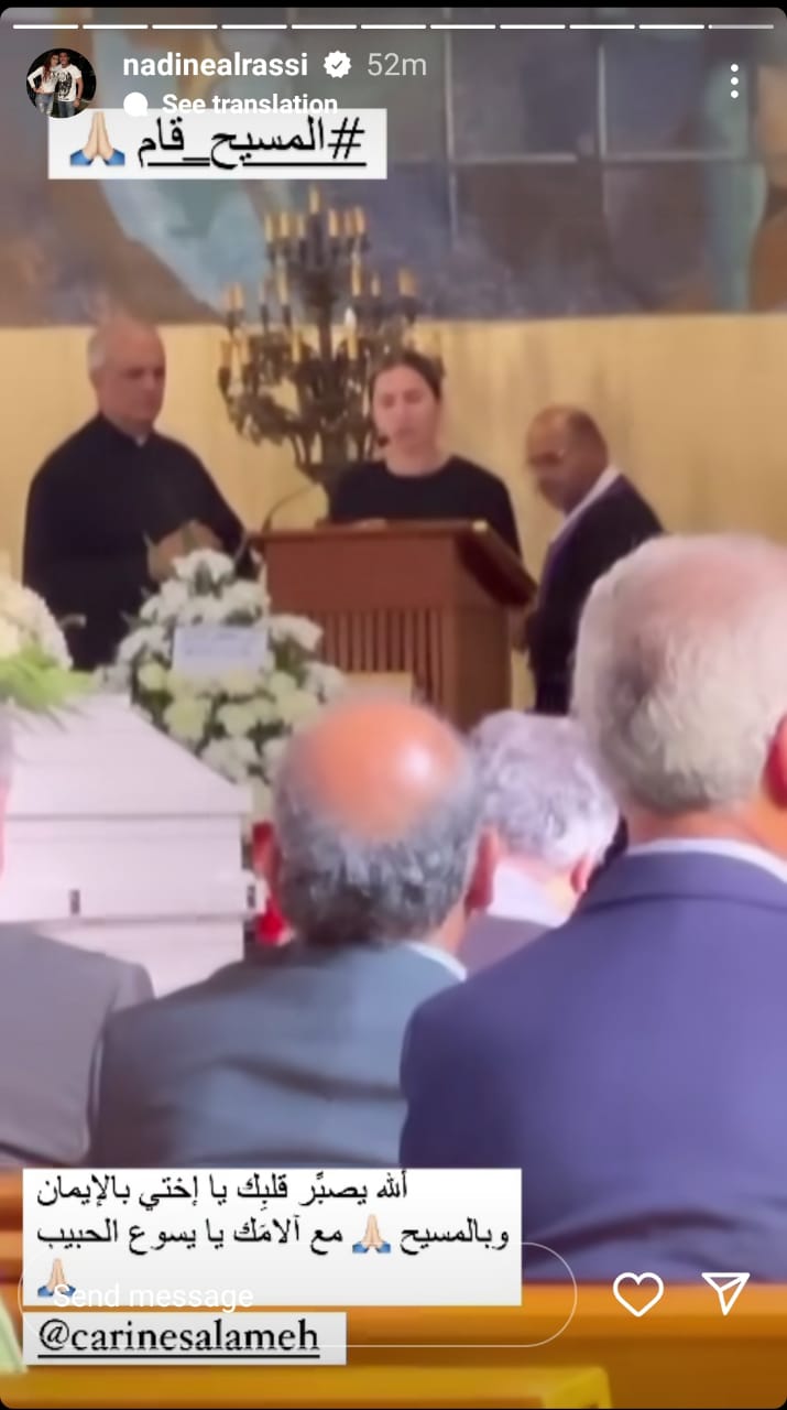 نشرت الممثلة نادين الراسي فيديو عبر خاصية الستوري عبر حسابها على “انستغرام” لمقدمة البرامج والممثلة كارين سلامة أثناء تلاوتها كلمة في جنازة شقيقها لوران سلامة الذي توفي جراء أزمة قلبية عن عمر 39 عاماً.