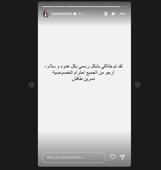 وكتبت نسرين عبر خاصية الستوري في إنستغرام: “لقد تم طلاقي بشكل رسمي بكل هدوء وسلام، أرجو من الجميع احترام الخصوصية”.