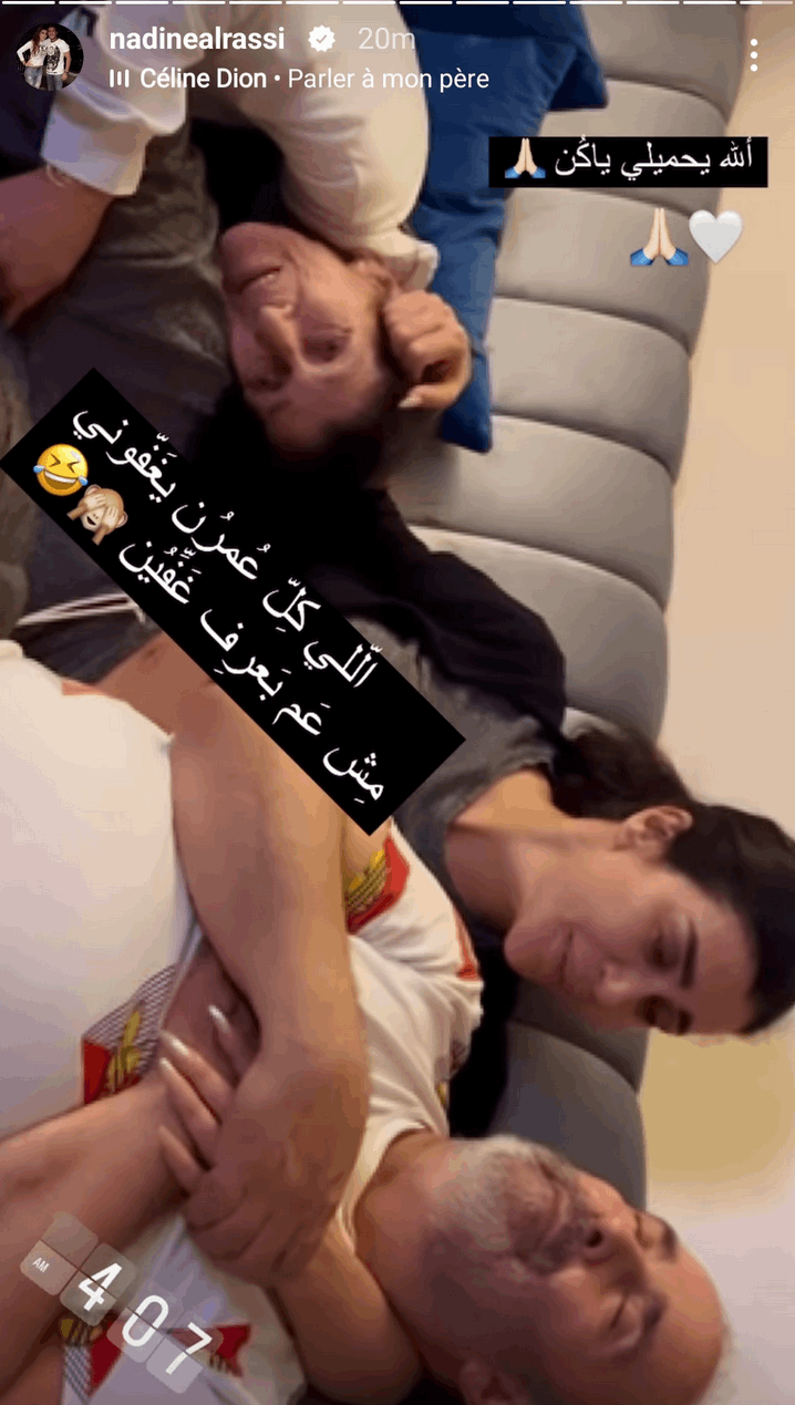 إلى ذلك نشرت نادين صورة عبر خاصية “الستوري” على حسابها الخاص على انستغرام وهي تغمر والديها، معلّقة عليها بالقول: “اللي كل عمرن يغفوني مش عم بعرف غفين”.